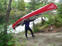 It wasn't until a 2-day canoe trip in August and then a 4-day canoe trip in September including more than 6 kilometres of portages that other features of the Myth became apparent, such as weight and capacity. For a 16' canoe the Myth has a considerable amount of carrying capacity. Because the Myth has a flared side it is a full 37" wide by the time the sides reach the gunwales. This allows for plenty of room for all but the largest packs to be placed sideways in the canoe. The relatively small float tanks also result in room behind the stern seat for a medium size pack or other miscellaneous gear. Our choice to replace the standard sliding bow seat with a fixed seat and to replace the solo thwart with a straight thwart also added to the useable space. We've found that the Myth will easily accommodate our relatively generous supplies that normally accompany us on a trip.